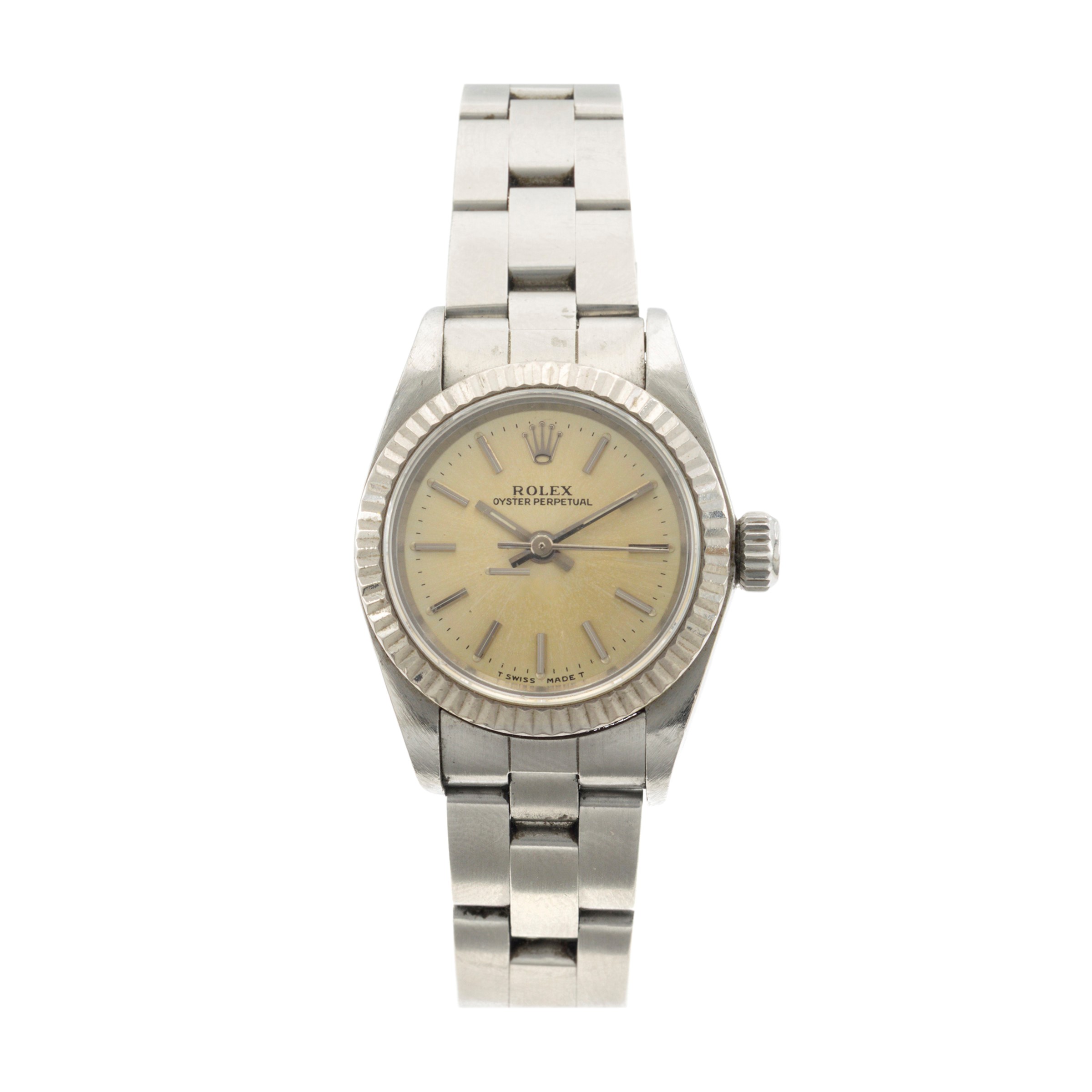 in acciaio, ref. 67194 - T410709, cassa 26 mm. quadrante champagne con indici, movimento meccanico a carica automatica, calibro 2130, bracciale oyster in acciaio con chiusura deployante, completo di scatola e garanzia