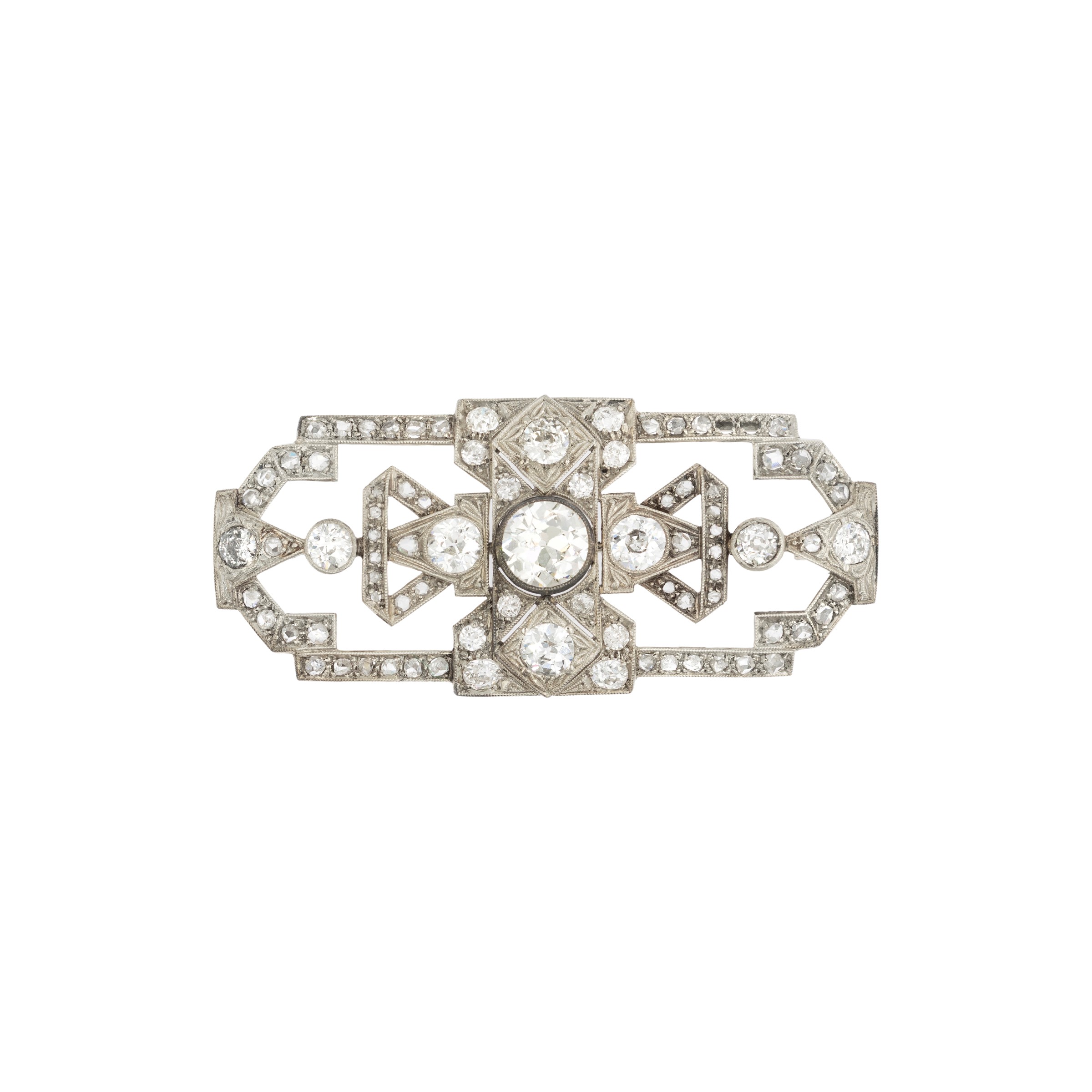 Spilla Decò in oro bianco 18kt centrata da un diamante taglio vecchio