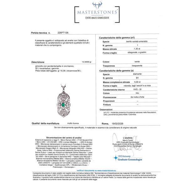 peso 19 gr.taglio brillante e vecchio ct 5 circa e rose di diamante colore H/J - purezza VVS/SI, smeraldo taglio ottagonale a gradini ct 1,30 circa, dimensioni 7x3 cm. completa di antica collana in oro bianco 18kt, lunghezza 45 cm. completo di certificato gemmologico e scatola originale