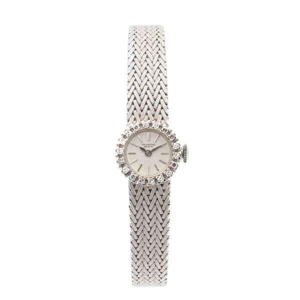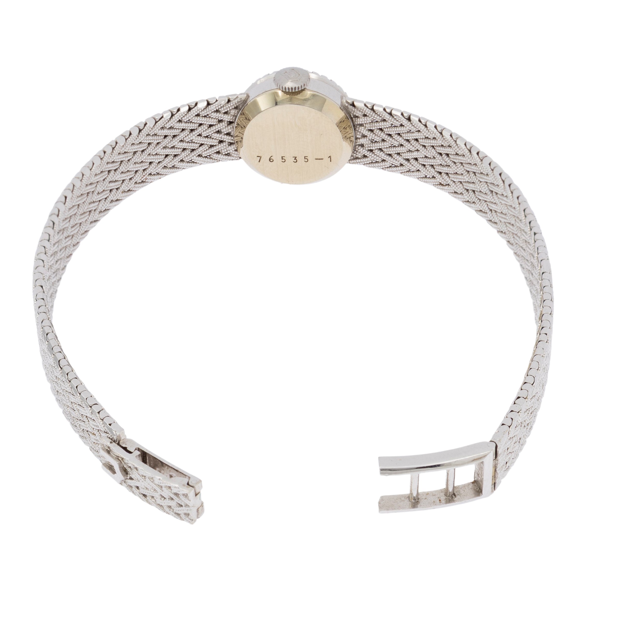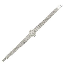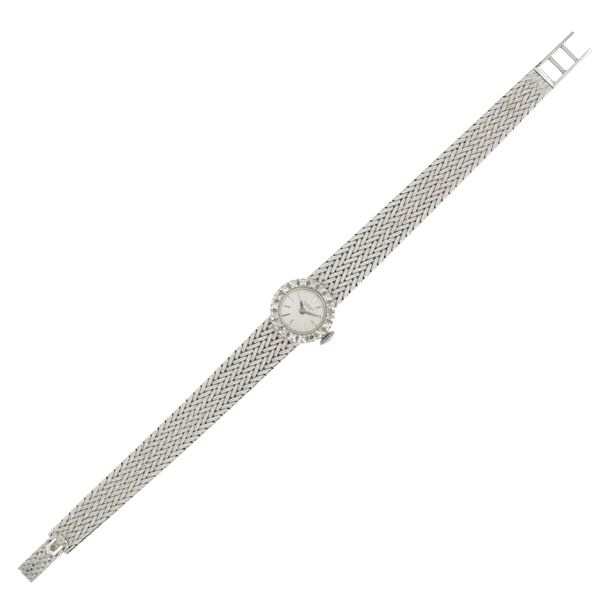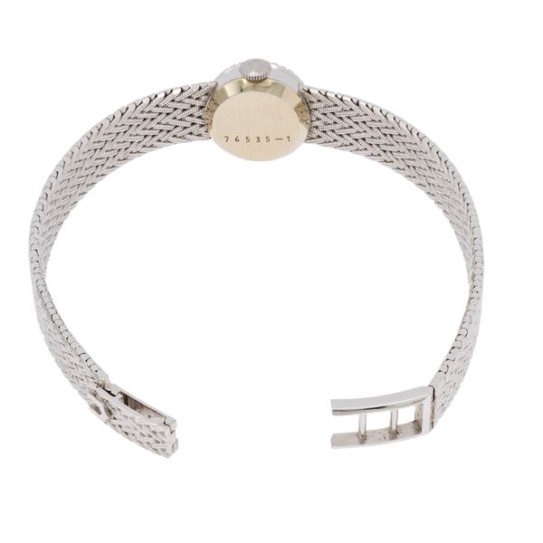 peso 31 gr.in oro bianco 18kt, ref. 76535-1, cassa 15 mm. con diamanti taglio brillante, quadrante argentato con indici, movimento meccanico a carica manuale, calibro 540 bracciale in oro bianco 18kt, lunghezza 17 cm. cassa, quadrante e movimento firmati