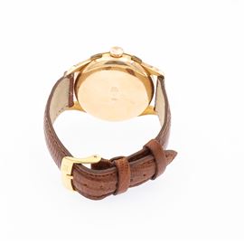 peso netto oro 13 gr.in oro giallo 18kt, cassa tonda 37 mm. quadrante argentato con indici e numeri arabi, due quadranti ausiliari per il cronografo, scala tachimetrica, scala dei minuti primi, movimento meccanico a carica manuale, calibro Landeron 48, cinturino con fibbia in metallo dorato