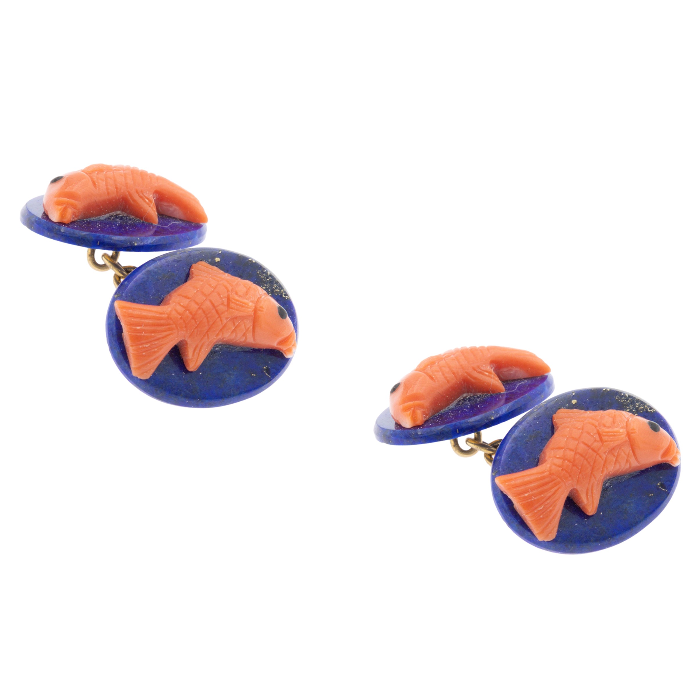 Gemelli in oro giallo 18kt lapislazzuli e corallo scolpito