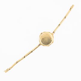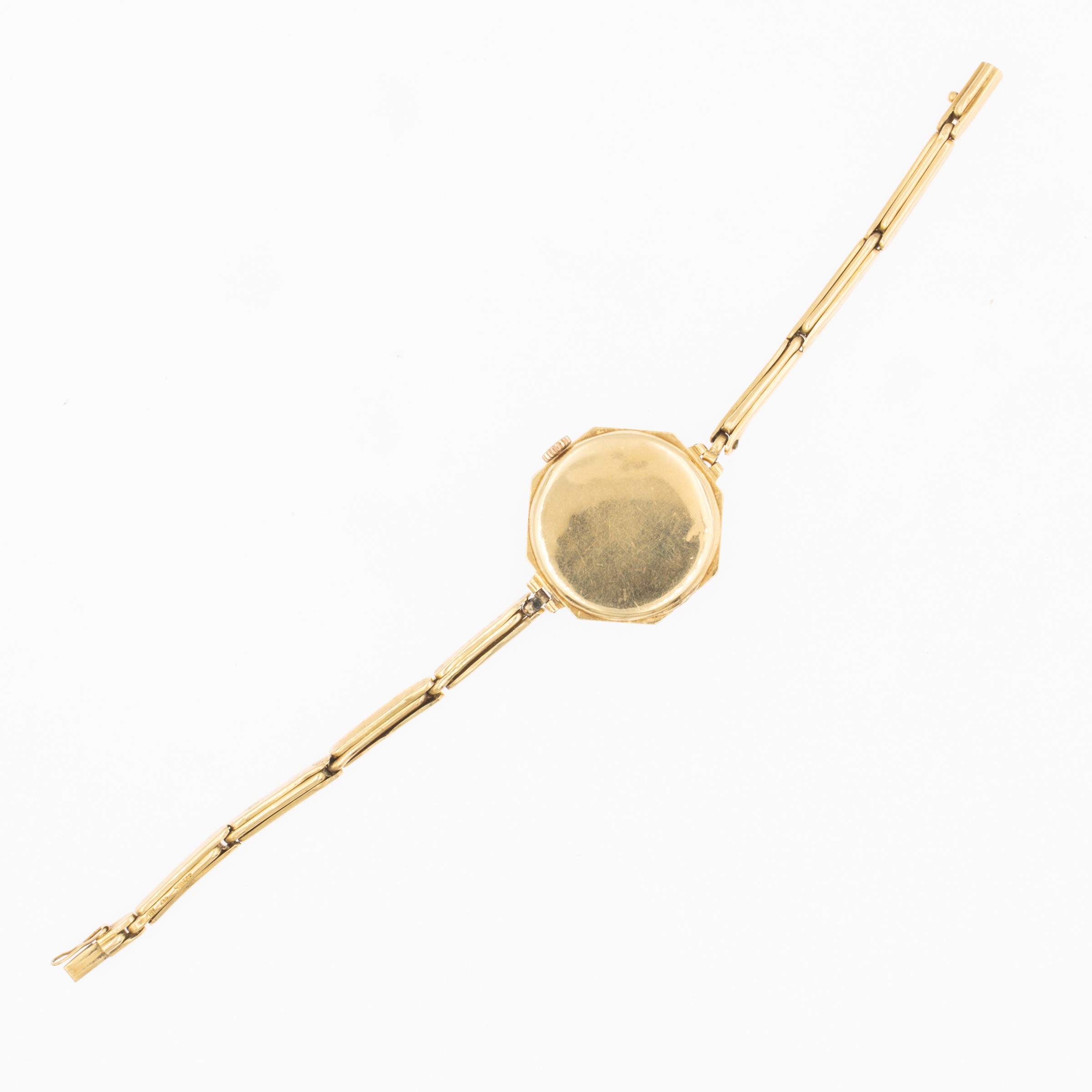 peso 17 gr.in oro giallo 18kt, ref. 257690, cassa ottagonale 2,5 mm. quadrante dorato con numeri arabi, movimento meccanico a carica manuale, bracciale in oro giallo 18kt, segni di usura, lunghezza 17 cm.
