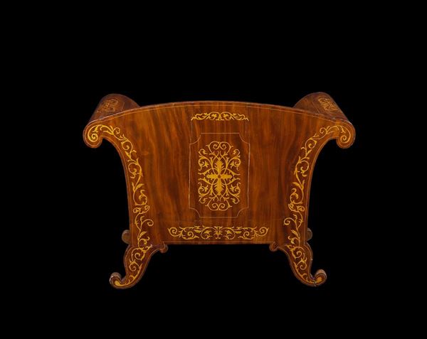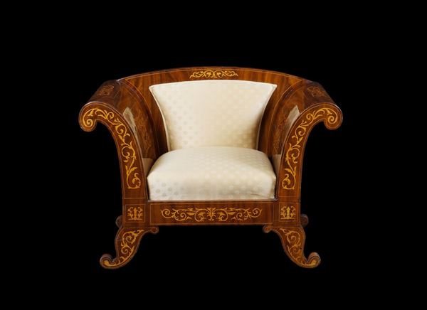 carved in boxwood with vegetal and scroll patterns, seats and seatbacks covered in fabric, 86x200x55 cm. (sofa) e 76x105x54 cm. (armchairs)