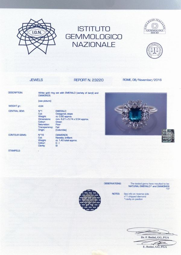 octagonal-cut weighing approx. 0,90 ct, from Colombia, surrounded by navette-cut diamonds weighing approx. 1,40 ct color G/I-clarity S/I, size 18. Comprising I.G.N n.23220 , peso 4,80 gr.