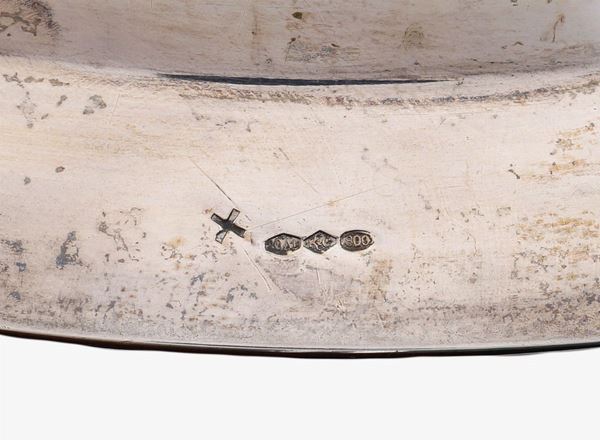 silversmith  Ricci & Co., circular shaped with borders decorated with palms, double scroll shaped handle, 17x41 cm.