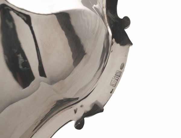 knurled line with engraved profile and chiseled motif of shells, goldsmith silversmith Henry Messulam active since 1935, 6x40x32,5 cm., peso 1000 gr.