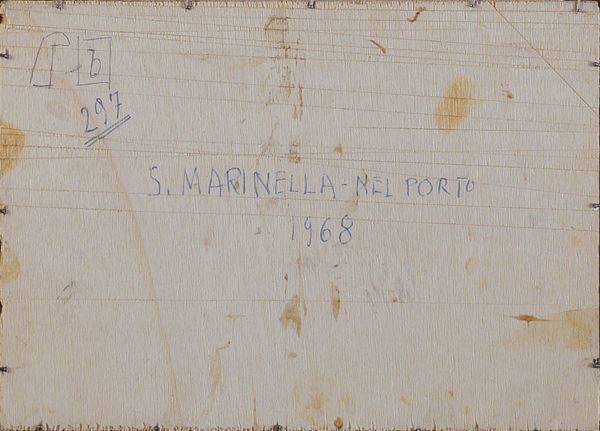 " Santa Marinella's harbour", oil on plywood, signed and dated 1968 on the left bottom, in a giltwood frame, 12x17 cm.