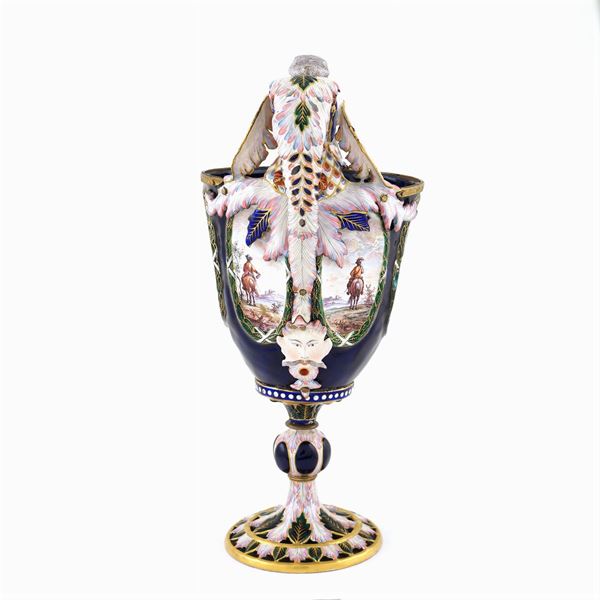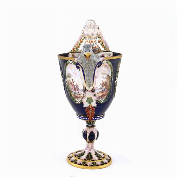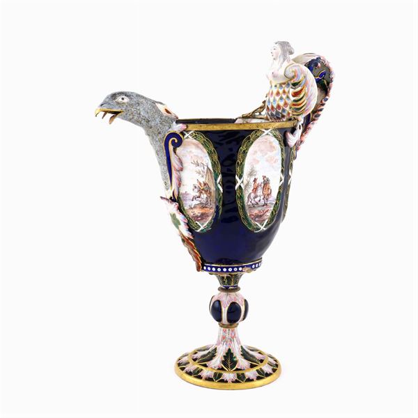 cup entirely decorated with a polychromatic enamel on a blue background with oval plaques featuring figures and landscapes, scroll handle decorated with a winged female figure, circular base, defects c, h. 30