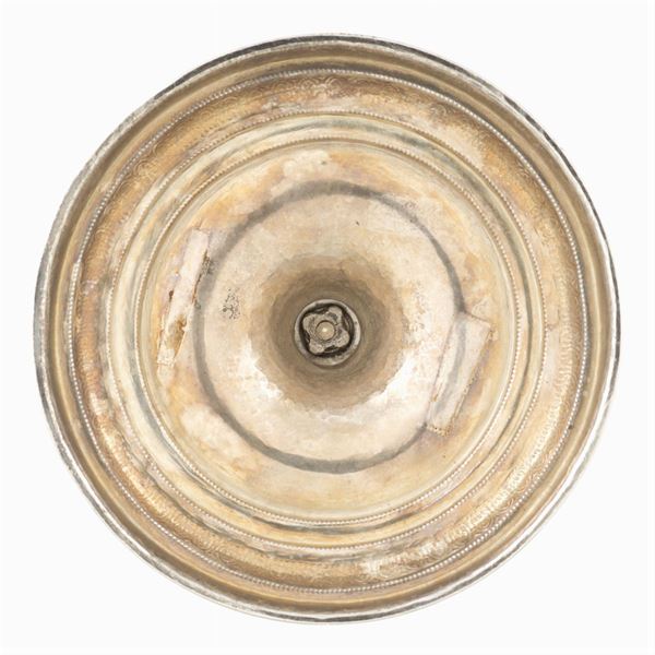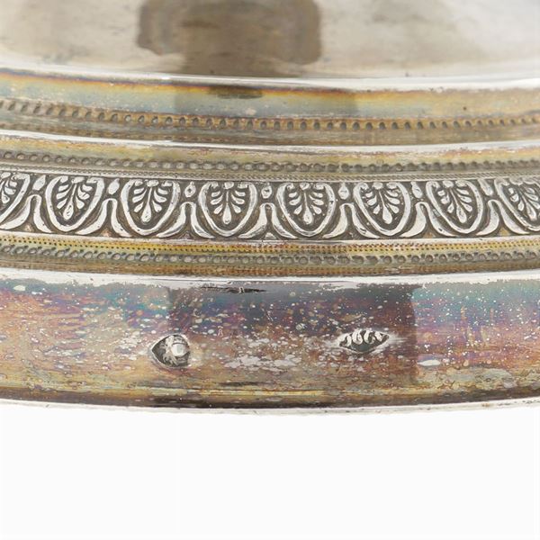 silversmith Angelo Giannotti (1824 - 1865) (mark n.562), circular and gadrooned base, the band at the top of the trunk is decorated with garlands and lion's heads, standing on a tripod base, h. 32 cm.