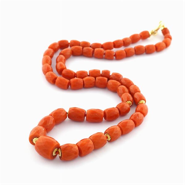 composed of numerous faceted coral beads, spaced by elements and a 18kt gold clasp, l. cm 50O, peso 62,90 gr.
