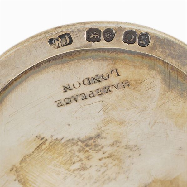 silversmith Richard Sibley I (London 1816 - 1834), oval base standing on four foot bases, scroll shaped handle, 22x24x12,5 cmo, peso circa 500 gr.