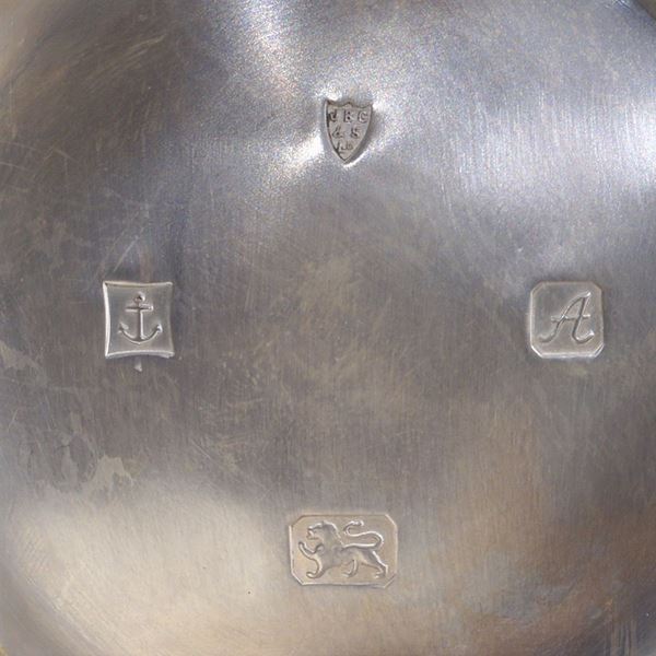 silversmith JB Chatterley & Sons Ltd, circular base, plain surface, scroll wood handle, pine cone shaped lid handle, h. 28 cm. Provenance: Rome, Bulgari., peso 954 gr.