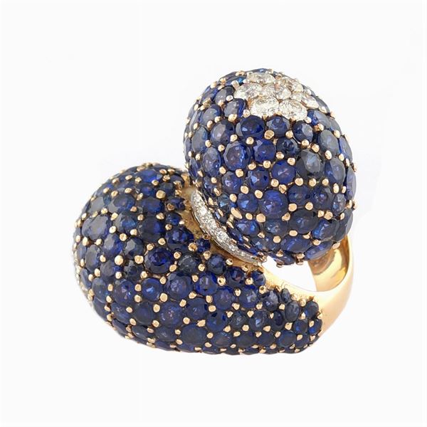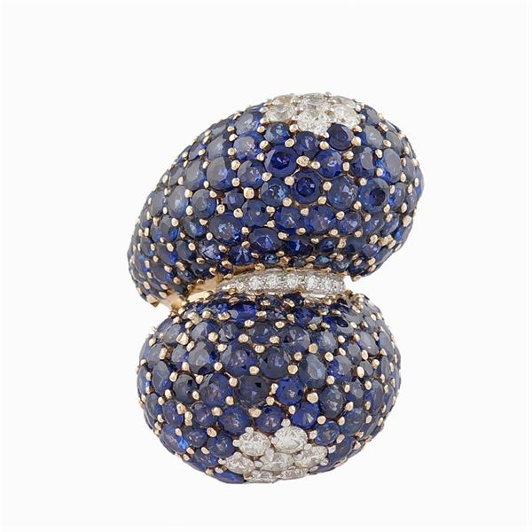 contrarie pattern with round sapphires approx ct 18 and brilliant cut diamonds approx ct 2, size 18, peso 46,9 gr.