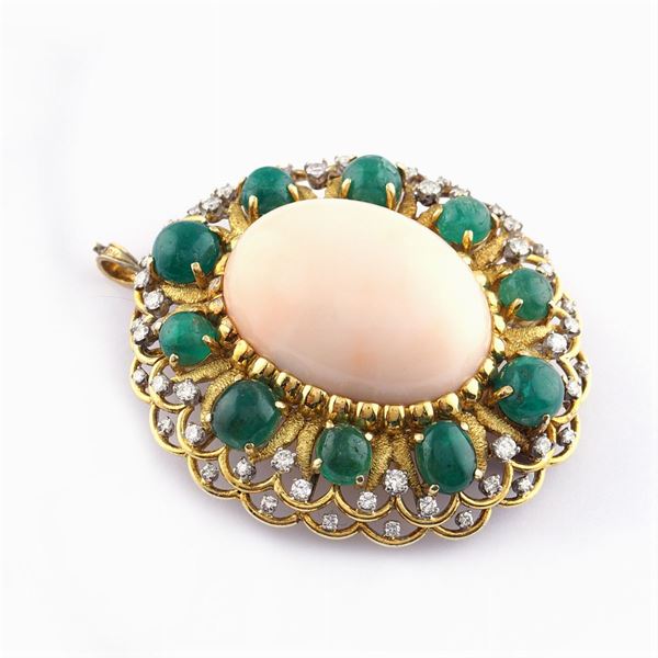 centered by a cabochon cut pink coral outlined by cabochon cut emeralds and brilliant cut diamonds approx ct 1.20, peso 56,2 gr.
