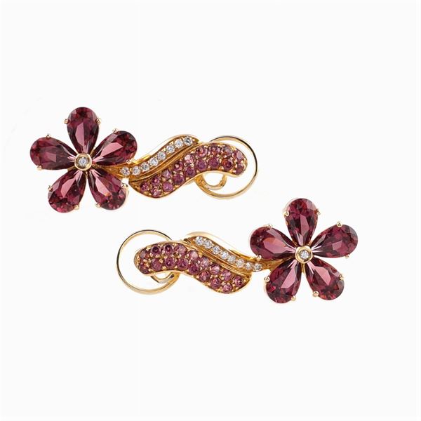 with tormaline in purple shade in drop and round cut with brilliant cut diamonds approx ct 0,20, peso 14 gr.