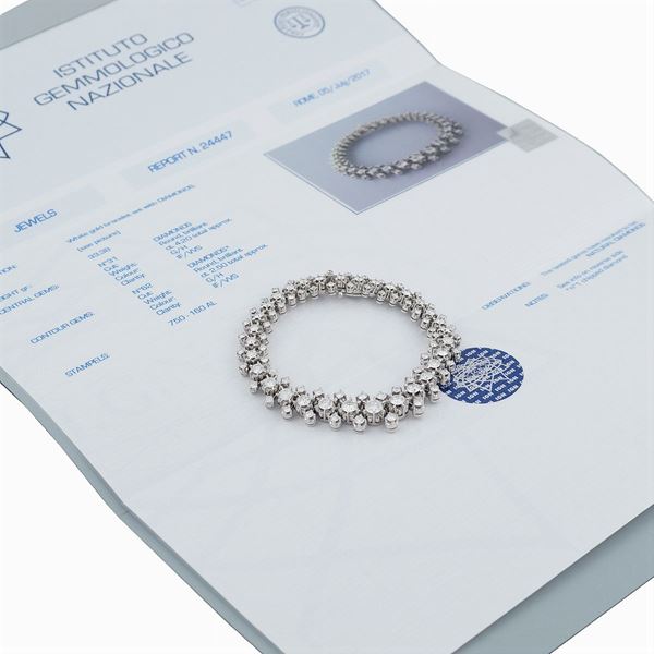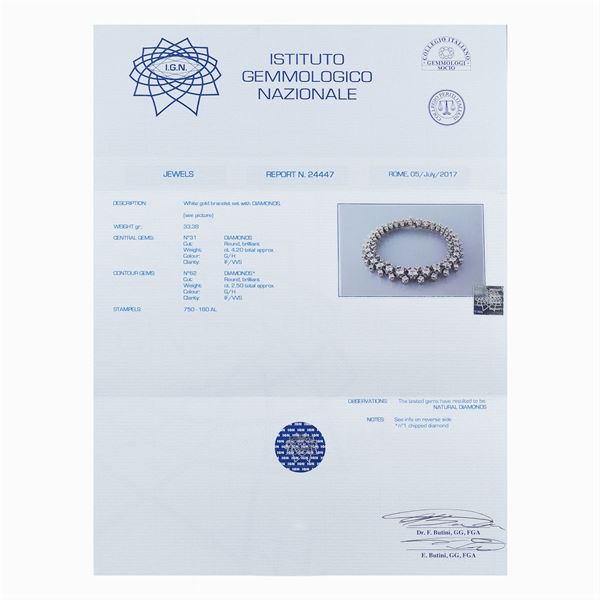 brilliant cut approx. ct 6.70, graded, G / H color - IF / VVS purity, 7 cm. lenght. Complete with gemological certificate I.G.N. n. 24447, peso 33,5 gr.