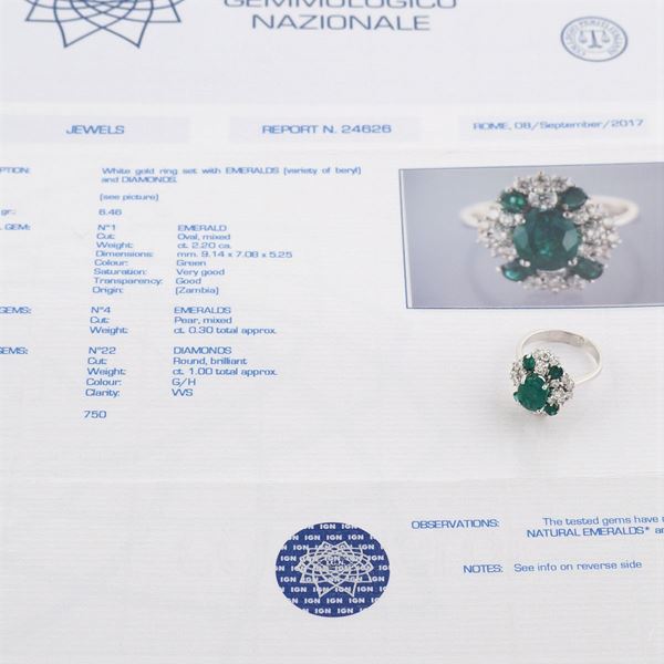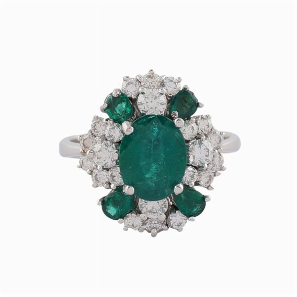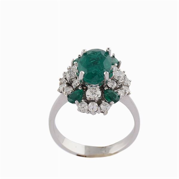 Oval cut approx ct 2.20, provenance Zambia, surrounded by brilliant cut diamonds approx ct 1, G / H color - VVS purity and four drop cut emeralds approx ct 0.30, size 16.5
