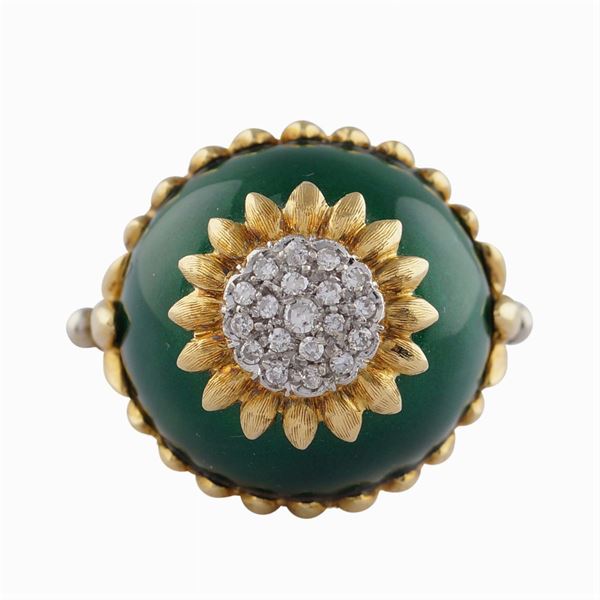 with enamel drawing in the shade of green, centered by a gold flower and brilliant cut diamonds approx ct 0.40, size 15, peso 12,8 gr.