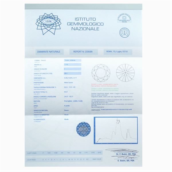 color I - purity VS1, medium fluorescence. Complete with gemmological certificate I. G. N. n. 22696