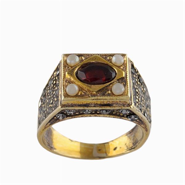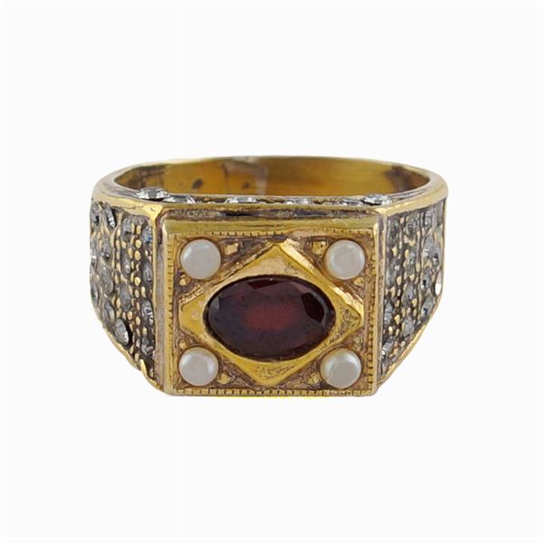 four small pearls and diamond roses at the sides, peso 5,3 gr.