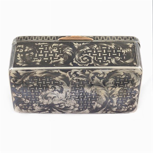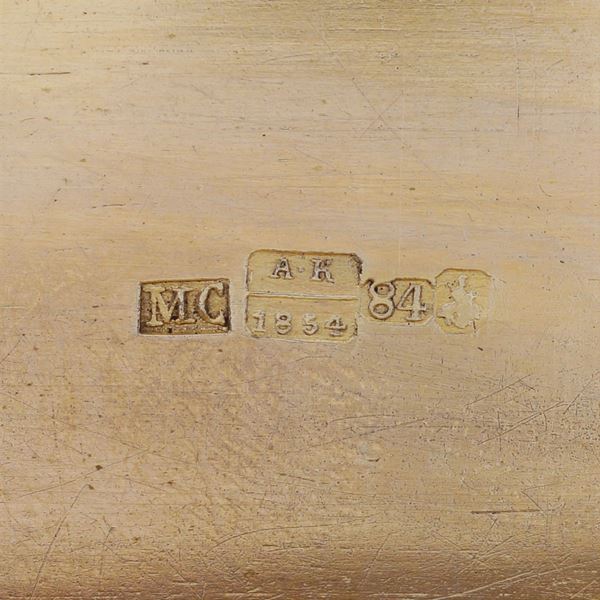 carved surface with vegetal and scroll patterns, silversmith Sergeev Matvej Vasilevic, duty Andreì Antonovich Kovalbskiì, marks inside, 3,3x9x4,7 cm., peso 140 gr.