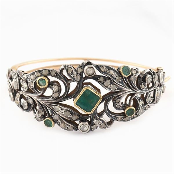 floral pattern centered by an emerald approx 2 cm surrounded by diamond roses and four round emeralds, diameter 6 cm, peso 26,5 gr.