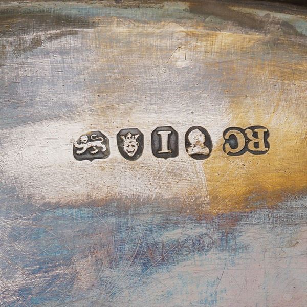 smooth body with embossed and chased profile with vegetal patterns, with eight amber glass ampules with silver caps and lids, jewelery silversmith Richard Cook-London, 23x40x23 cm., peso 1100 gr.