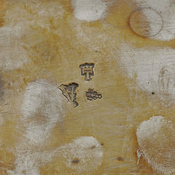 goldsmith J. J. Baudet, oval body with beaded profile resting on four legs, pierced and decorated with vegetal patterns ampule holders, 9,5x29x16 cm, peso 620 gr.