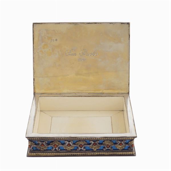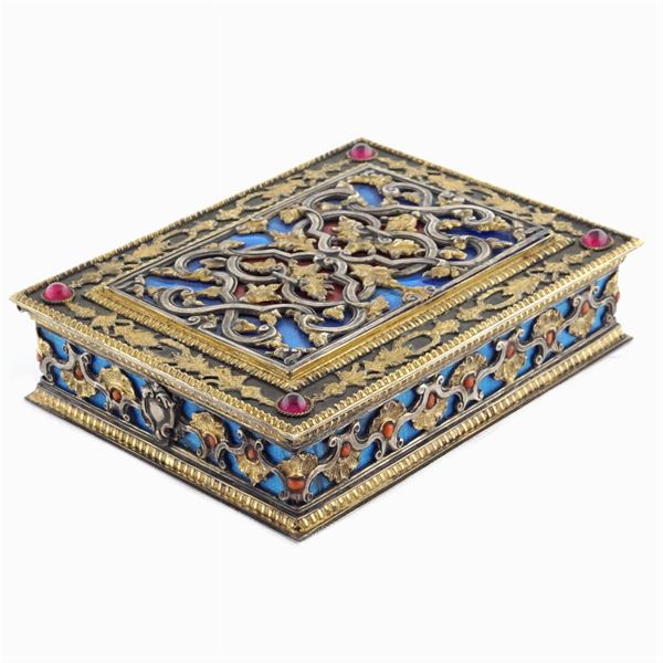 rectangular shape entirely decorated with enamel, vegetal and volute motifs with embossed semi-precious stones, 3x13,6x13,5 cm., peso lordo 613 gr.