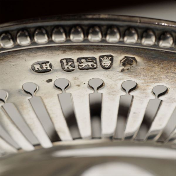 oval shaped with pierced profile and base, centered by a heraldic crest, 12x34,5x25 cm., slight defect, peso 970 gr.