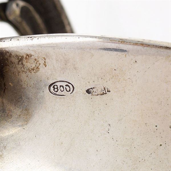 smooth body with scroll shaped handles, and chased base with vegetal patterns and volutes, silversmith Guerci, Alessandria 17x60x21 cm., peso 2030 gr.