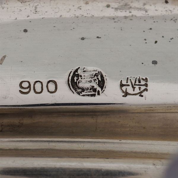 fluted body with shaped profile, decorated handle lid with volutes, signed Ostorero - Turin, 14x26x26 cm., peso 1707 gr.
