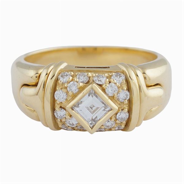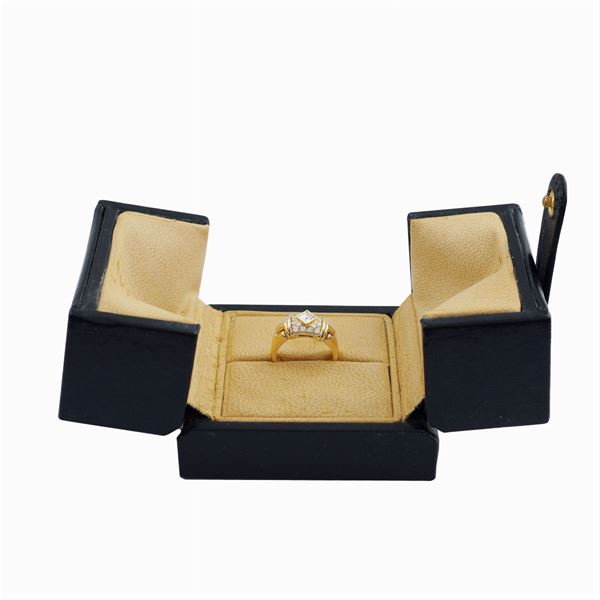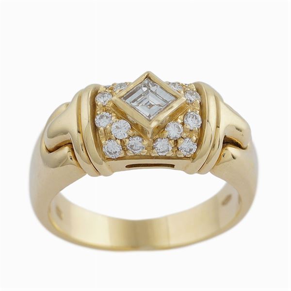 with carrè cut diamonds approx. ct 0.18 surrounded by brilliant cut diamonds approx ct 0.20, size 10 Complete with box, peso 8,1 gr.