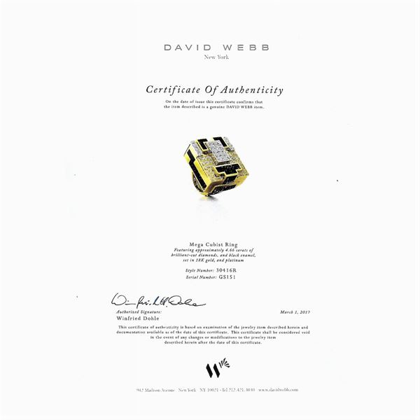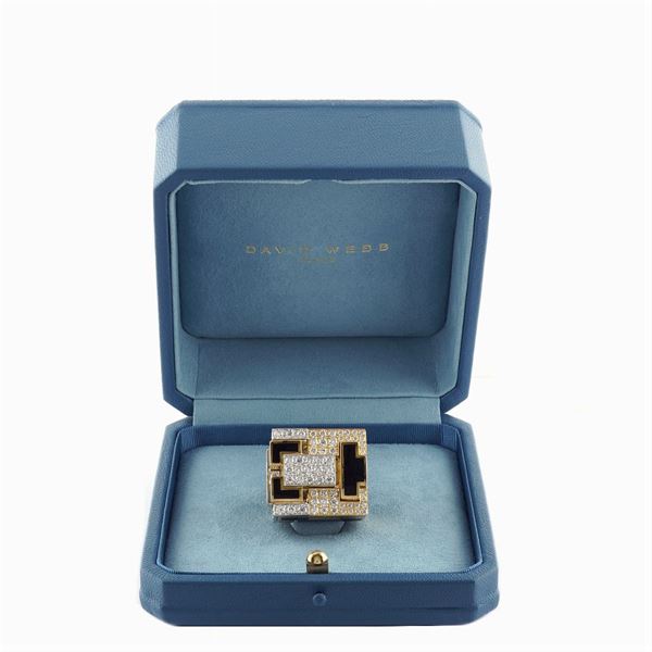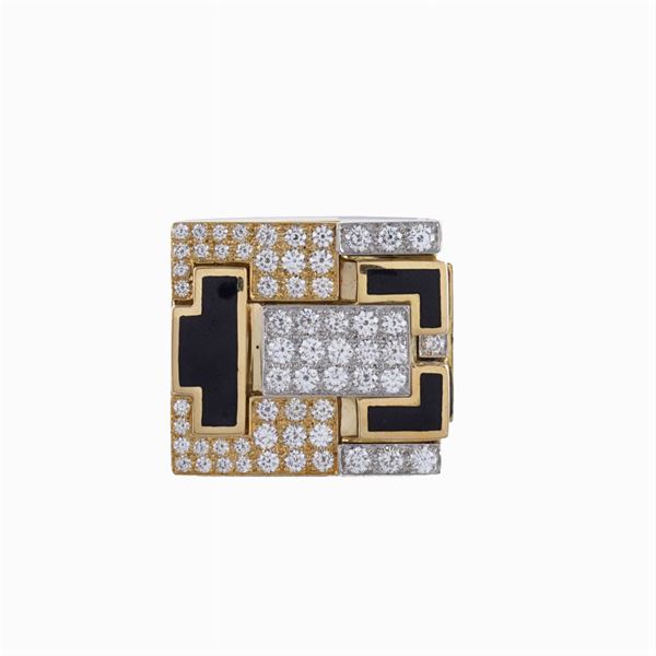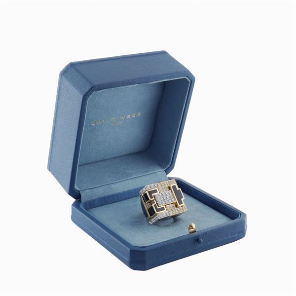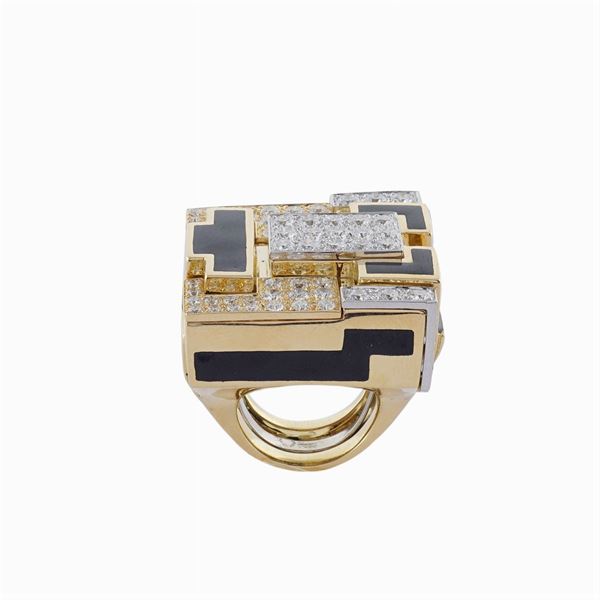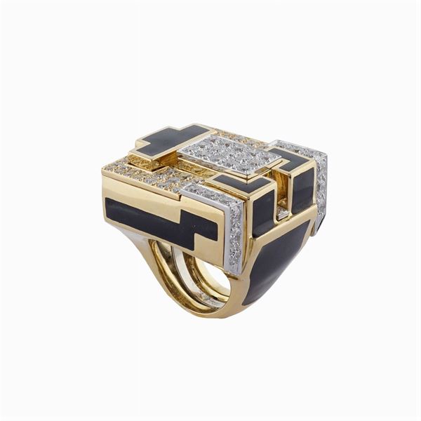 18kt yellow gold and platinum sculpture ring with black enamel and brilliant cut diamonds ct 4.66, size 13