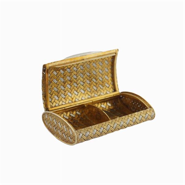18kt two color gold basket shaped, a double compartment inside, casket closure embellished with brilliant cut diamonds approx 0.25 cm, measures 1.30x5x3 cm., peso 42,4 gr.