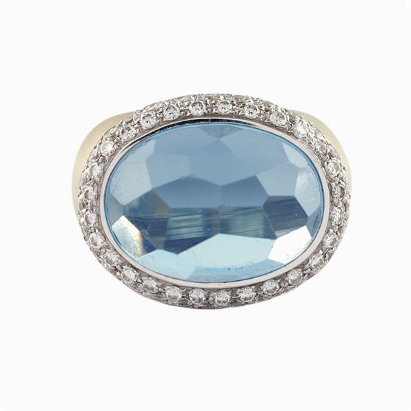 in white and yellow satin gold with oval briolet cut aquamarine surrounded by brilliant cut diamonds ct approx. 1,20, size 13.
