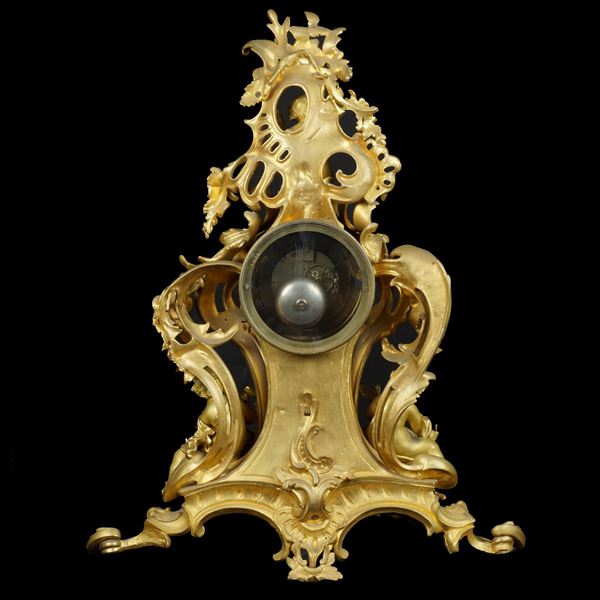 finely chiselled in gold to depict allegorical cherubs and floral and vegetal patterns, bronze dial and enamel with Roman numerals (missing hands), slight usury, 70x57x28 cm.