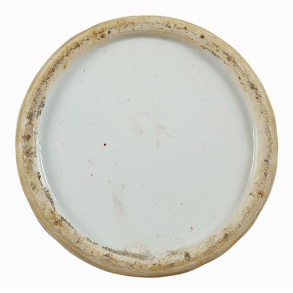 decorated in a polychromy with depictions of court life scenes with floral, vegetal and bird patterns on the rest of the body, zoomorphic handles, slight defects, h. 58 cm.