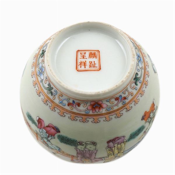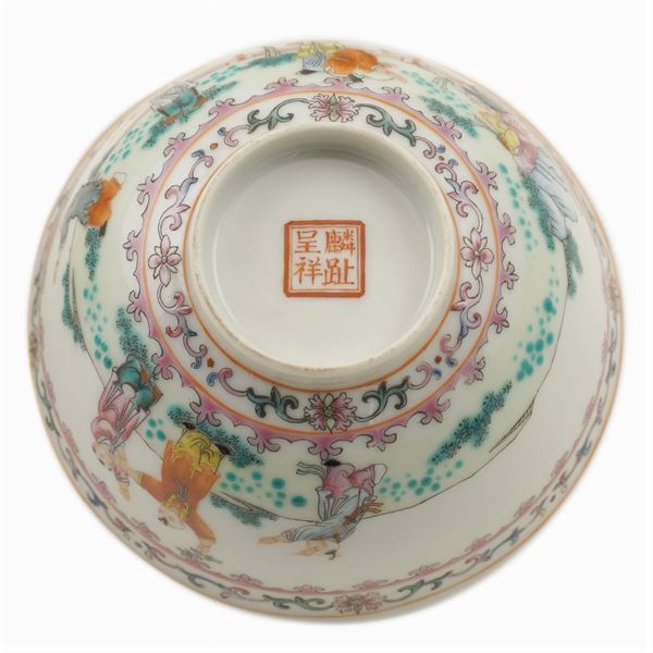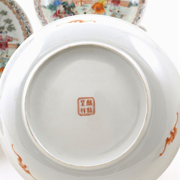 painted in polychromy decorated profile with floral patterns and centered by scenes of children playing on white background, the lower rim is also decorated with  bats, consisting of 9 plates of a diameter of 23 cm, 10 bowls h . 5,5 cm., d. 12 cm. and two small vases, marked under the base,signs of use and one of the vases presents a small restoration on the base