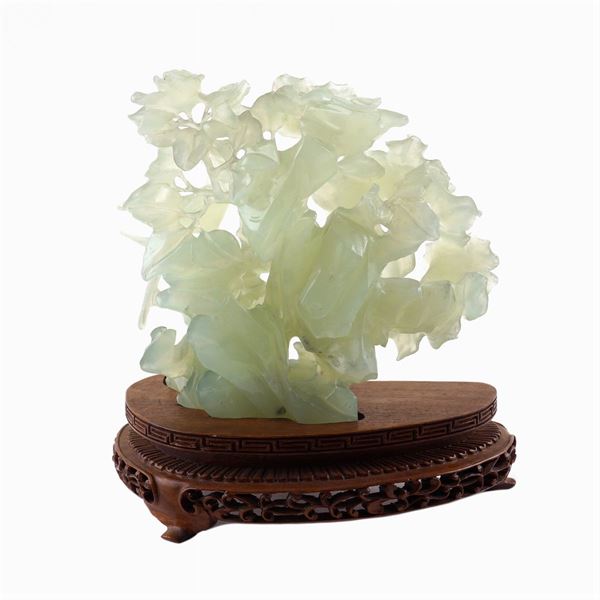 carved to represent a floral composition with birds, resting on a wooden shaped base, h. 17,5 cm.
