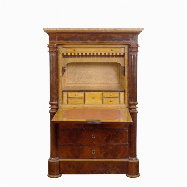 five drawers on the front, Erable interior with drawers, several compartments and desk partially covered in leather, defects and minor losses, 169x111x49 cm.