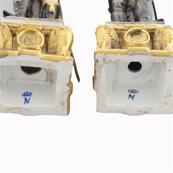 "Napoleon and a Ussaro soldier", painted in polychromy and resting on golden porcelain squared bases, marked under the base, h. 26 - 28 cm.