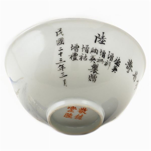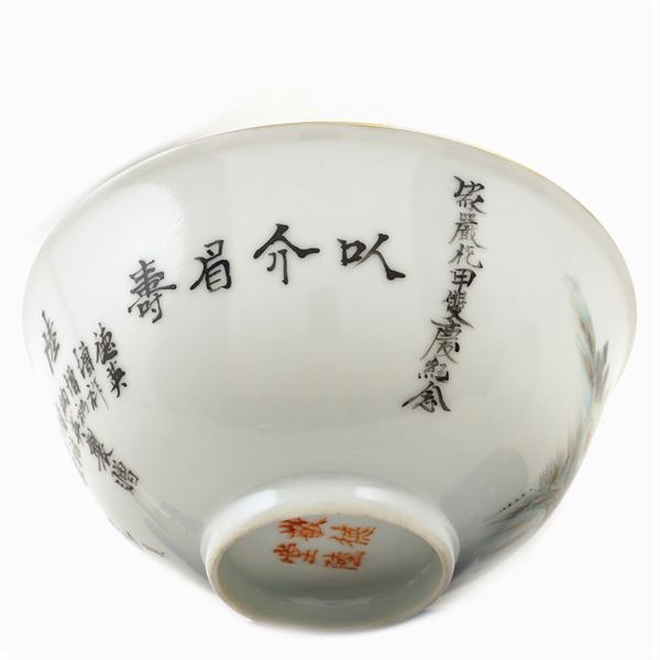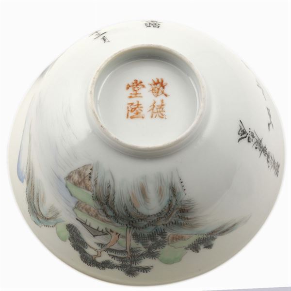 decorated in polychromy on white background with landscapes and poems, interior decorated with a stylized "Shou" symbol, Shen de Tang Shi mark under the base, 6x12 cm.