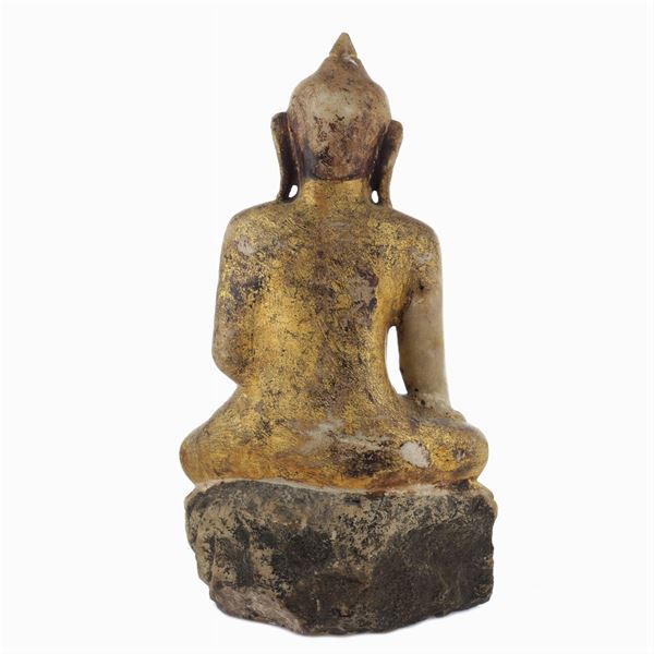 depicting Shakyamuni seated in vajraparyankasana position with a hand laid in bhumisparshamudra and the other in dhyanamudra, the figure is elengantly dressed in a dress draped on a shoulder, 52x28x12 cm.