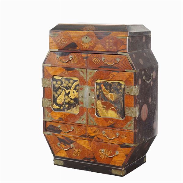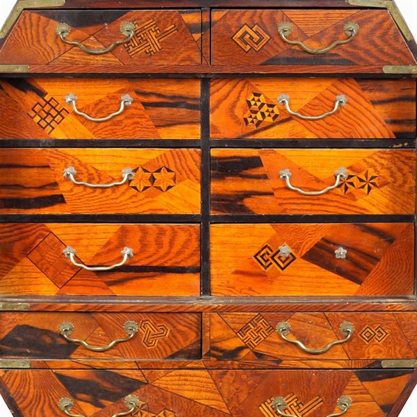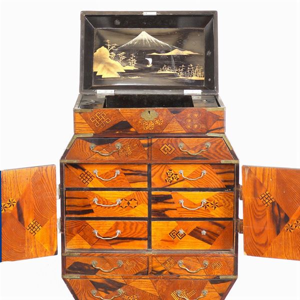 inlaid with different woods with geometric patterns, front with seven drawers and two doors decorated with chinoiserie panels with other six drawers inside, top with a compartment with tilting door, bronze friezes and handles, slight defects, 73x44x23 cm.