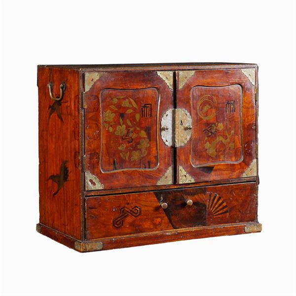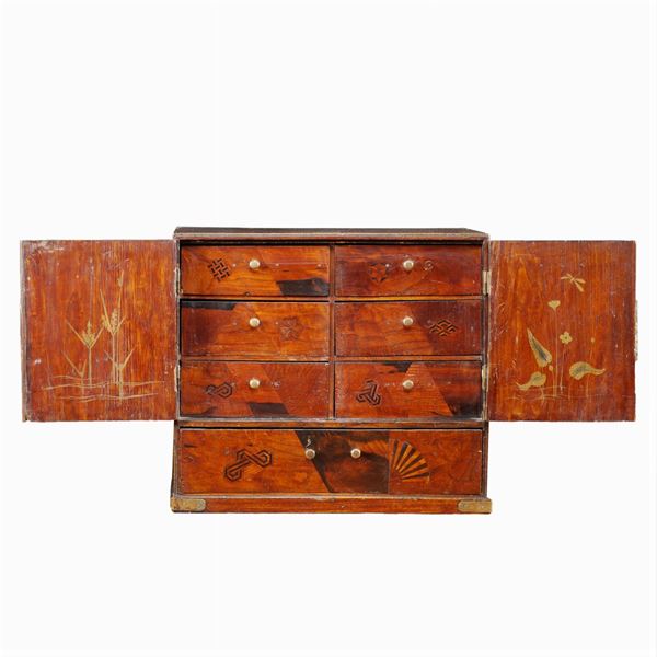 decorated with floral and birds patterns, front with two doors with six drawers inside, and a drawer below, bronze friezes and handles, slight defects, 40x45x25 cm.