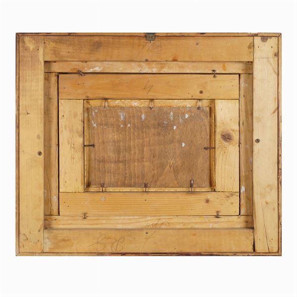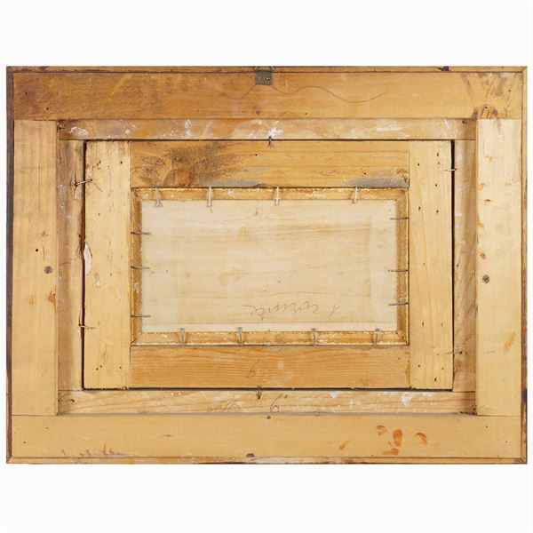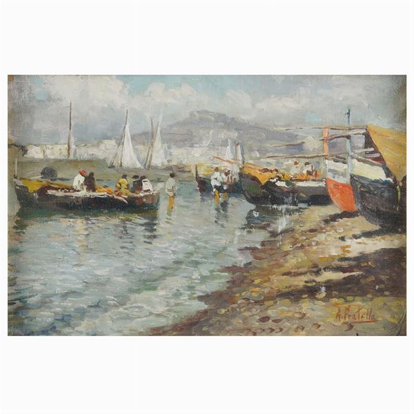 "Marine with boats and fishermen in the bay of Naples", pair of oils on panel, signed on the bottom right, framed, 12x22,5 cm.