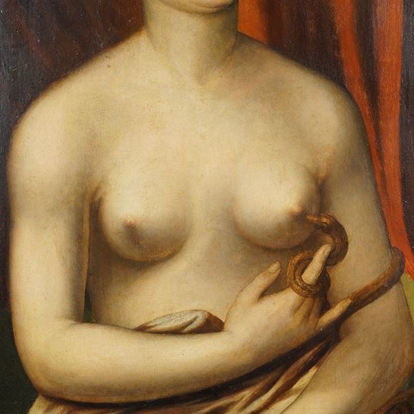 "Cleopatra", oil on panel within golden and lacquered wood coeval frame.