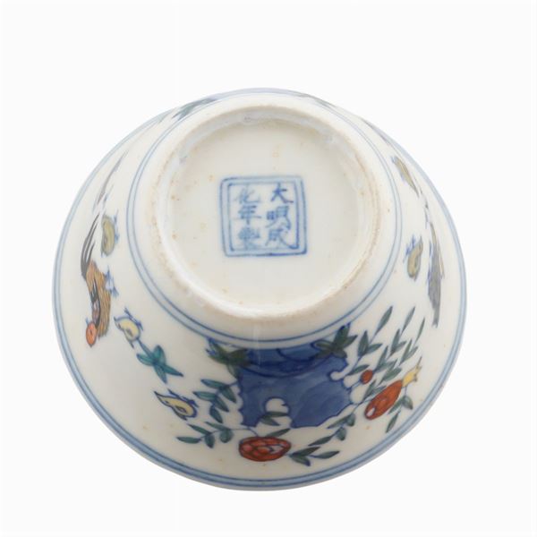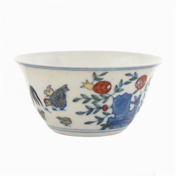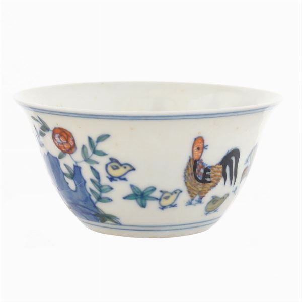 painted in polychrome on a white background and decorated with chicken, hen, chicks and floral and vegetal patterns, marked under the base.With a certificate of thermoluminescence analysis of TecnArt srl, Turin, dated January 23, 2017, peso 40 gr.